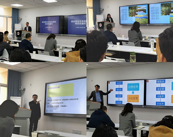 比赛现场气氛活泼热烈、精彩纷呈。各参赛教师结合自己的学科专业特色,深入挖掘各门课程蕴含的思政元素,在20分钟的说课、授课时间内,把思想政治教育的内涵潜移默化融入到课堂教学中。王龙海老师从演绎推理的第一个逻辑体系——“三段论”角度展示了人的思维形式的一种抽象。李颖晖老师讲述了鲍德里亚的符号消费理论的“红”与“黑”,引导消费者要以绿色、理性消费来助推社会生态文明建设。王琼老师以“赋、比、兴”三种修辞手法解读了”《国风·周南·关雎》的美学思想,为我们展现了诗歌中清新自然的意境之美和哀而不伤的思情之美。姜勇君老师通过黑格尔的自由思想揭示出中国特色社会主义制度在战胜疫情中的优越性。张磊老师就关于人的价值中西方看法及其对人成长意义展开论述。