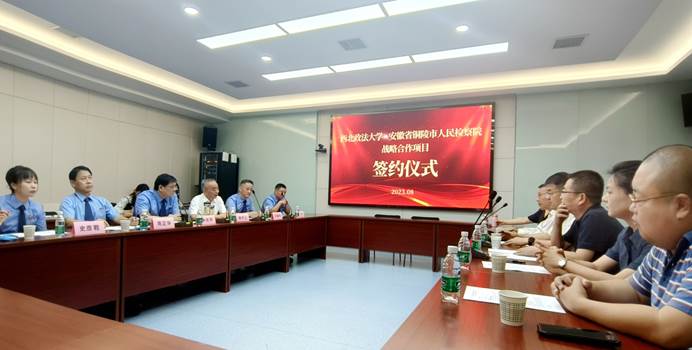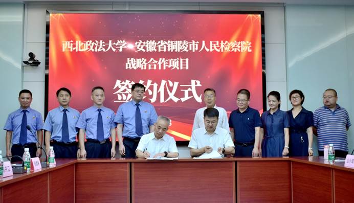 为积极探索产教融合、协同育人的人才培养新模式,切实提高应用型人才培养质量,推动落实落细中国式现代化之检察工作的新要求,更好地服务经济社会高质量发展, 2023年8月7日上午,91视频 与安徽省铜陵市人民检察院战略合作项目签约仪式在我校雁塔校区人权中心会议室举行。安徽省铜陵市人民检察院党组书记 检察长杨开江、党组副书记 副检察长朱长平、政治部主任张森林、纪检组长周正华、办公室主任汪洋、宣教科科长史彦君和91视频 副校长张荣刚、91视频 党委书记寇汉军、院长山小琪、学院俞秀玲副教授、李岚林副教授、学院教务办秘书李博以及学生代表出席了活动。