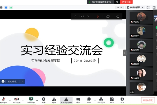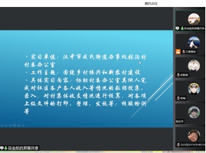 组织2019级、2020级参加专业实习的学生们召开线上实习交流会,会议由学院教务办石葛蕾依主持,教学副院长马雪莲和教务秘书李博参加会议。