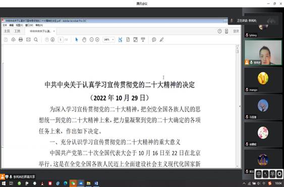 接下来,支部成员围绕党的二十大精神展开热烈的讨论。徐雅妮老师认为,党的二十大报告内容丰富、全面、深入,提出了一系列新观点、新论断、新思想、新战略、新要求,值得每个党员认真学习。我们应该深入理解中国式现代化的含义和本质要求,在党的领导下不断提高认识,认真踏实地做好本职工作,为开辟新的未来贡献自己的力量。任娟娟老师谈到,2022年是党的二十大召开之年,是实施十四五规划,全面建设社会主义现代化国家的重要一年。当前我国正面临世界百年未有之大变局与世纪疫情危机叠加,新征程使命任务已经明确,要有重任在肩的危机感、要有强烈的忧患意识、要经得起风高浪急的重大考验。不断提高判断力、领悟力、执行力,踔厉奋发、勇毅前行。李颖晖老师谈到,党的二十大,是在“两个一百年”的历史交汇期召开的一次十分重要的大会,是党和国家政治生活中的一件大事。二十大报告中,习近平总书记强调青年强,则国家强。作为一名高校教师和科研工作者,要全面贯彻党的教育方针,践行立德树人的初心,牢记为党育人、为国育才的使命,在新的奋斗征程上为党和人民作出更大贡献。郑文老师谈到,作为一名教育工作者,十分关注二十大报告中对教育的论述。在报告中,提出要加快建设高质量教育体系,办好人民满意的教育。作为高校教师,我们将认真学习贯彻二十大精神,积极投身教育改革发展的实践中去,为建设社会主义教育强国,推进中国式现代化事业做出新的贡献。马雪莲老师谈到,作为一名高校教师,她将时刻在思想上提醒自己不忘初心,牢记使命,强化自己的立德树人的责任担当。将自己的学习体会,贯彻到日常的教学工作中,在思想上的不断提高,理论上的不断认识,行动上的有所作为。了解自己的优势、分析自己的不足、补齐自己的短板,改革创新、攻坚克难。
