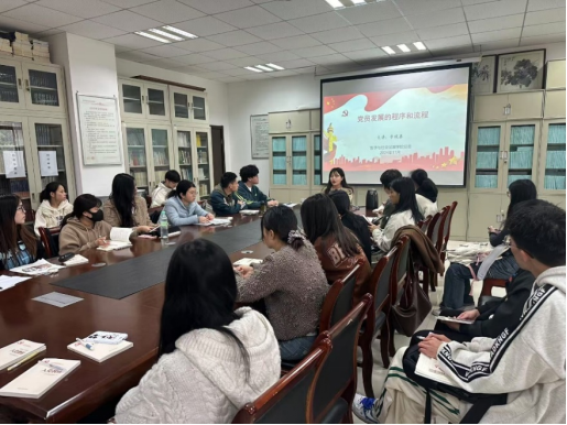 李彧嘉为大家讲解了党员发展的程序和流程,将发展党员的五个阶段结合学院的实际情况为大家进行了详细说明,并就党章和党的纪律有关内容,对同学们提出要求,指出作为大学生应当不断加强自我修养,提升政治觉悟,增强纪律意识、底线意识,认真学习提升专业能力,为实现中华民族伟大复兴的中国梦贡献力量。
