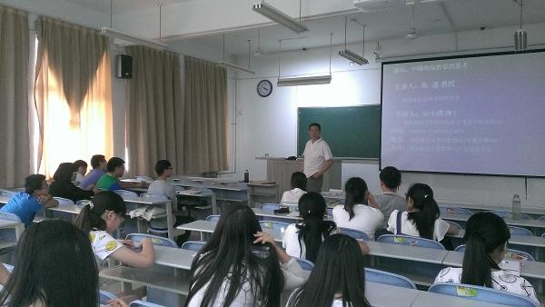 张蓬教授从传承中国传统文化角度出发,讲到了上古,接着讲到了汉朝的古文经和今文经之争,指出学习中国传统必须深刻把握古代经书,并特别列出《易经》、《黄帝内经》、《周髀算经》、《道德经》、《金刚经》、《心经》等六经是研究中国传统文化的不二法门。张蓬教授还谈到了中国传统文化和西方普遍思维模式的不同,西方文化强调“认知文化”和“可复制模式”追求普遍性真理,而中国文化讲求因时而动,顺势而为,讲求变化,强调唯一性。张蓬教授着重讲了中国传统思想文化的传承和发展的代理人,“士”这一个特殊阶层。谈到了“士”的政治依附性。张蓬教授分别从“士”的生存方式和“士”对制度的依附来阐述了中国传统思想文化的政治依附性。在讲到士的生存方式时张蓬教授讲了士的文化传承模式“述而不作,信而好古”,士由于“无恒产,有恒心”故而“士”本身是一个矛盾体,具有两面性。同时张蓬教授还倡导同学们向“士”靠齐建立起使命和责任,将来为家庭、社会和国家做出应有的贡献。