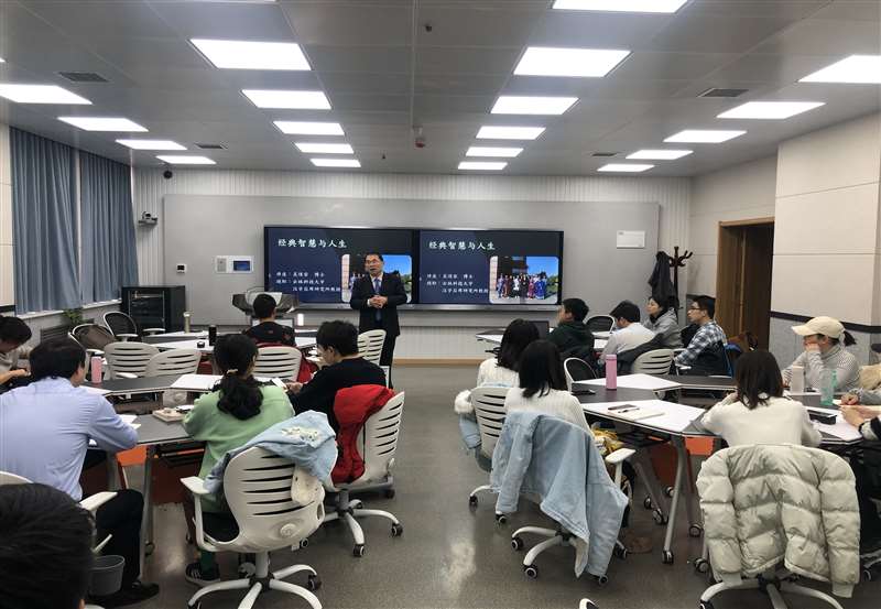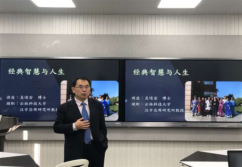 在5号教学楼407智慧教室举办了题为“经典智慧与人生”的学术讲座。此次讲座由台湾云林科技大学汉学应用研究所吴进安教授主讲,91视频