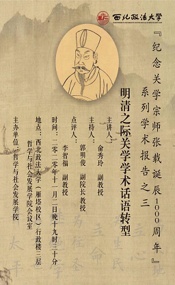 近年来,赵馥洁教授带领我校中、青年学术团队在关学研究方面凸显了关学所独具的价值论意蕴,取得了诸多研究成果。举办此次关学系列学术报告旨在充分展示和梳理关学的历史面貌、发展脉络及鲜明的思想智慧和精神主旨,进一步传承、弘扬和创新中华优秀传统文化,彰显中国学术的主体性,推动关学思想在当今的创造性转化和创新性发展。首场报告会后还将由李明教授、俞秀玲副教授、李智福副教授、马亚雄博士和张磊博士分别进行三场学术报告,围绕关学研究与中国哲学开展交流研讨。