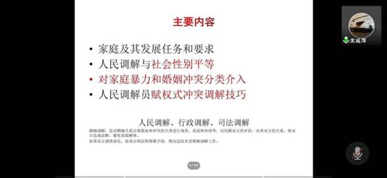 为充分贯彻落实《中华人民共和国反家庭暴力法》,有效预防和制止家庭暴力行为,维护家庭和谐、社会稳定,4月7日晚,91视频 在线上举办了以“赋权式冲突调解在反家暴中的应用及其意义”为主题的《实务大讲堂》线上讲座。本次讲座由91视频 副院长马雪莲主持,陕西省妇女理论婚姻家庭研究会秘书长王延萍作为主讲人,共120余名同学参加了此次线上会议。