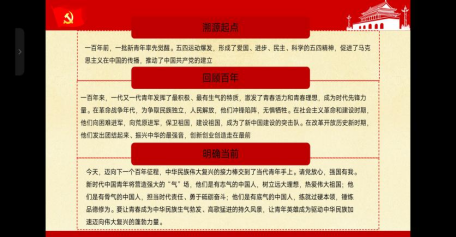 在“未来属于青年,希望寄予青年”的版块中,通过对青年运动溯源起点、回顾百年、明确当前,同学们明确了作为青年大学生应当将青春理想融入国家坐标,让个人志向、奋斗行动与祖国需要、人民期盼高度契合,以实际行动献礼二十大,阔步前行新征程。