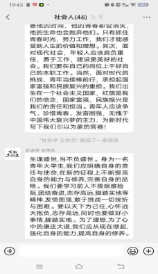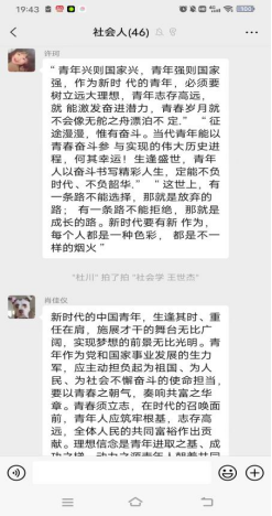 此次《以青春之我,承时代之任》主题团课受疫情影响采用线上方式进行,由我团支部副团支书刘珂欣组织开展,分为四个板块进行学习:1.奋进新征程,建功新时代;2.青年兴则国家兴,青年强则国家强;3一代人有一代人的使命,一代人有一代人的担当;4.未来属于青年,希望寄予青年。会议结束后在群内组织了此次团课的感悟分享,社会学班同学都积极发言,分享心得体会。
