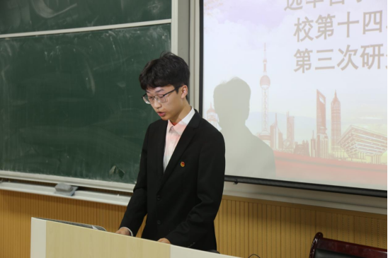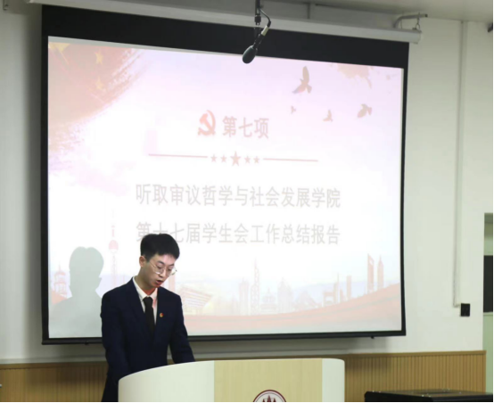 学院第十七次学生会主席团成员方凯旋进行了工作总结,充分肯定学生会在过去一年多的工作成果,同时指出在工作中的不足,希望大家能在今后的各项工作中加强团队协作与沟通能力,凝聚共识,更好地为广大师生服务。