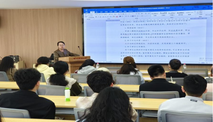 会议伊始,慕婧对学院研究生实训标兵与实训优秀生评选制度作出详细解读。她从评选标准、参评条件、评选流程到荣誉激励逐一说明,帮助同学们清晰了解各项规则。她鼓励大家以评优为导向,更以评优为起点,以更严谨、认真的态度投入实训学习,在实践中锤炼专业技能、提升综合素养。