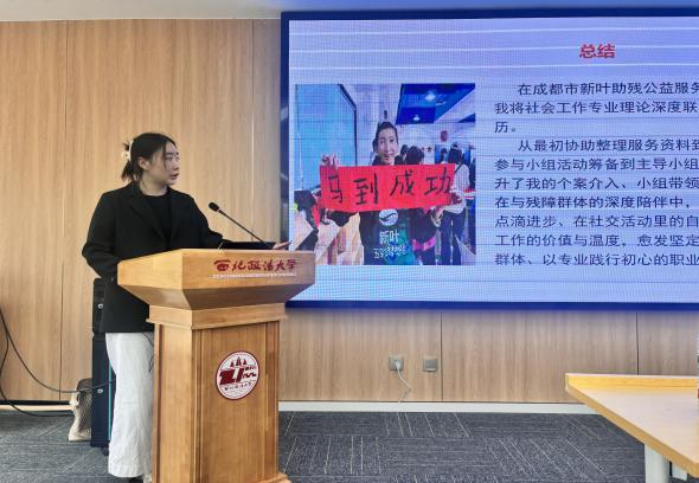 经验分享环节,荣获2025年秋季实训标兵和优秀实训生荣誉称号的2024级社工研究生张欣、陈洁鑫、鲁铭悦、周路帆依次登台。她们分别聚焦青少年与社区、助残与家庭、儿童与妇女、司法社会工作等不同实务领域,结合一线服务机构的真实场景与典型案例,系统分享了实训历程、专业方法的运用以及实务中的成长与感悟。扎实的内容与多元的视角,为在场同学提供了宝贵的经验参考。