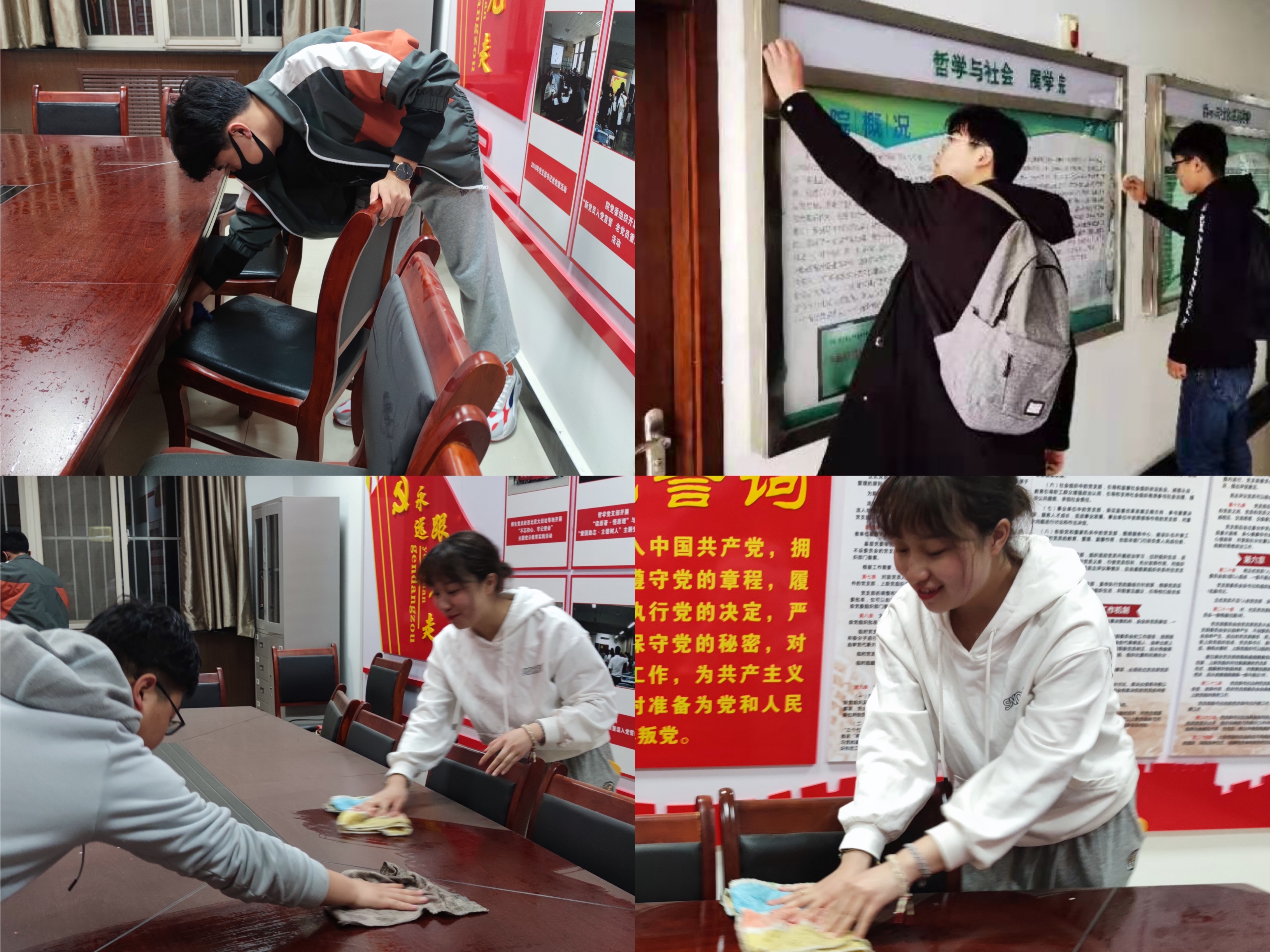 卫生清洁 劳动树新风,志愿我先行。2018级和2019级同学积极响应学雷锋志愿服务活动号召,自发组织志愿者清扫清洁学院党员活动室、会议室、宣传橱窗等公共设施和区域。