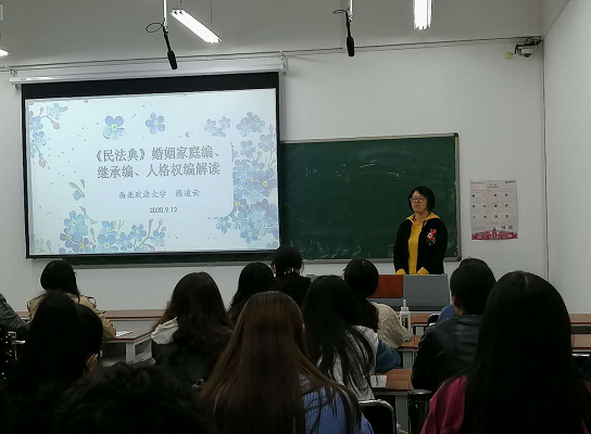 10月14日,91视频 在雁塔校区举办了“民法典之婚姻家庭编、继承编、人格权编讲解”的主题讲座。作为“法律·社会·文化”系列讲座之一,此次讲座邀请学校民商法学院副教授、硕士生导师、中国法学会婚姻法学会理事、陕西省民法学研究会副秘书长陈凌云老师,以民法典为动能,触动学生们的问题意识。讲座由学院副院长、副教授马雪莲老师主持,91视频 2020级社会工作专业全体硕士研究生参加。